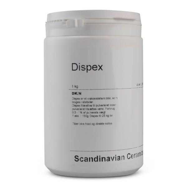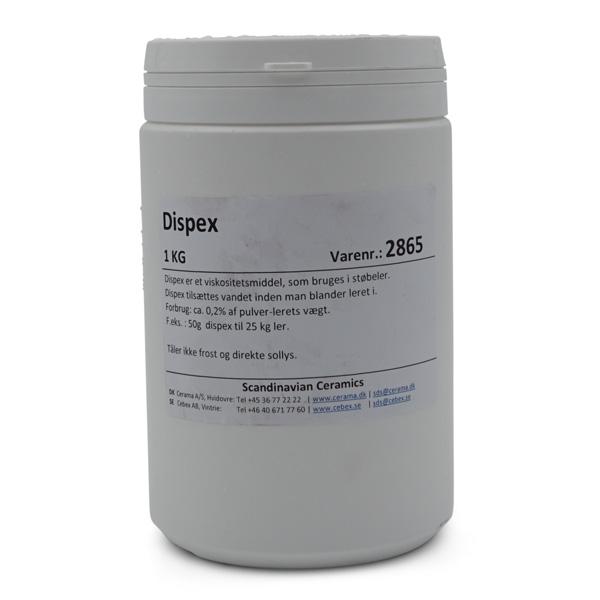 Dispex är ett dispergeringsmedel för gjutleror.Gjutlera som levereras i pulverform skall blandas med vatten (regnvatten eller annat mjukt vatten är en fördel men inte tvingande nödvändigt) och dispergeringsmedel för att ställa slamman (färdigblandad gjutlera) till rätt konsistens. Med endast några få droppar kan man ställa om en tjock slamma till en tunn och mer hällbar konsisens, för snabbare och mer effektiv gjutning.Efter att vatten, Dispex och pulverlera blandats bör blandningen stå och dra något dygn. Därefter ska slamman röras om försiktigt så att man inte blandar ner luft. När vi levererar slammor så har dispergeringsmedel redan tillförts och slamman är därför färdig att användas. Se våra blandningsrecept för mer info.